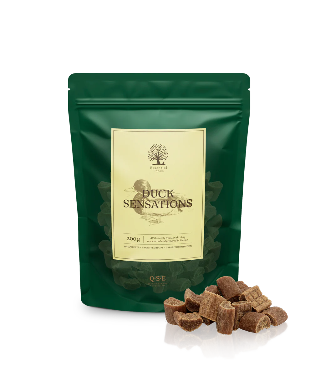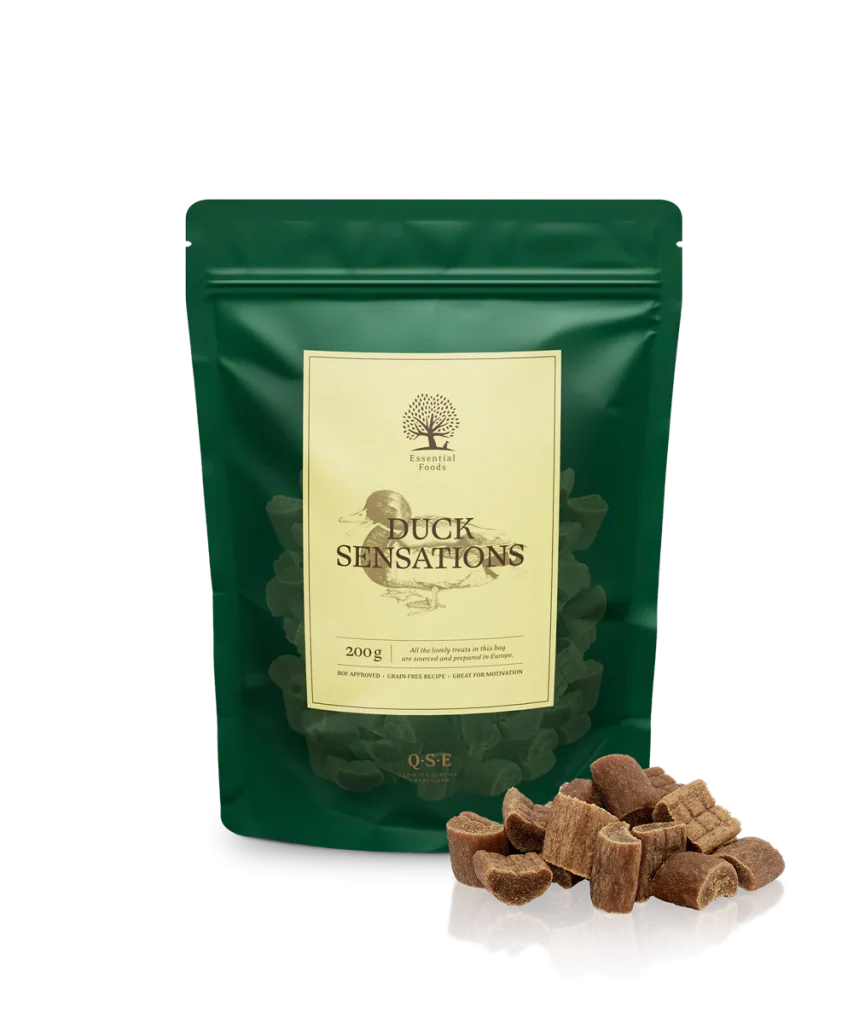 Essential Duck Sensation: tiene 90% de pato. ¡Nada más que añadir! Es un snack pequeño y de lo más sabroso, pensado para situaciones en las que se busca una pequeña y suculenta recompensa de 2-3 cm. Cree variedad con nuestros otros dos snacks SENSATIONS, que ofrecen CONEJO o TERNERA.