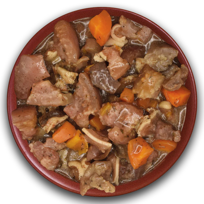 97% oreja de cerdo fresca en su salsa, guisantes, zanahorias, boniato, especias.