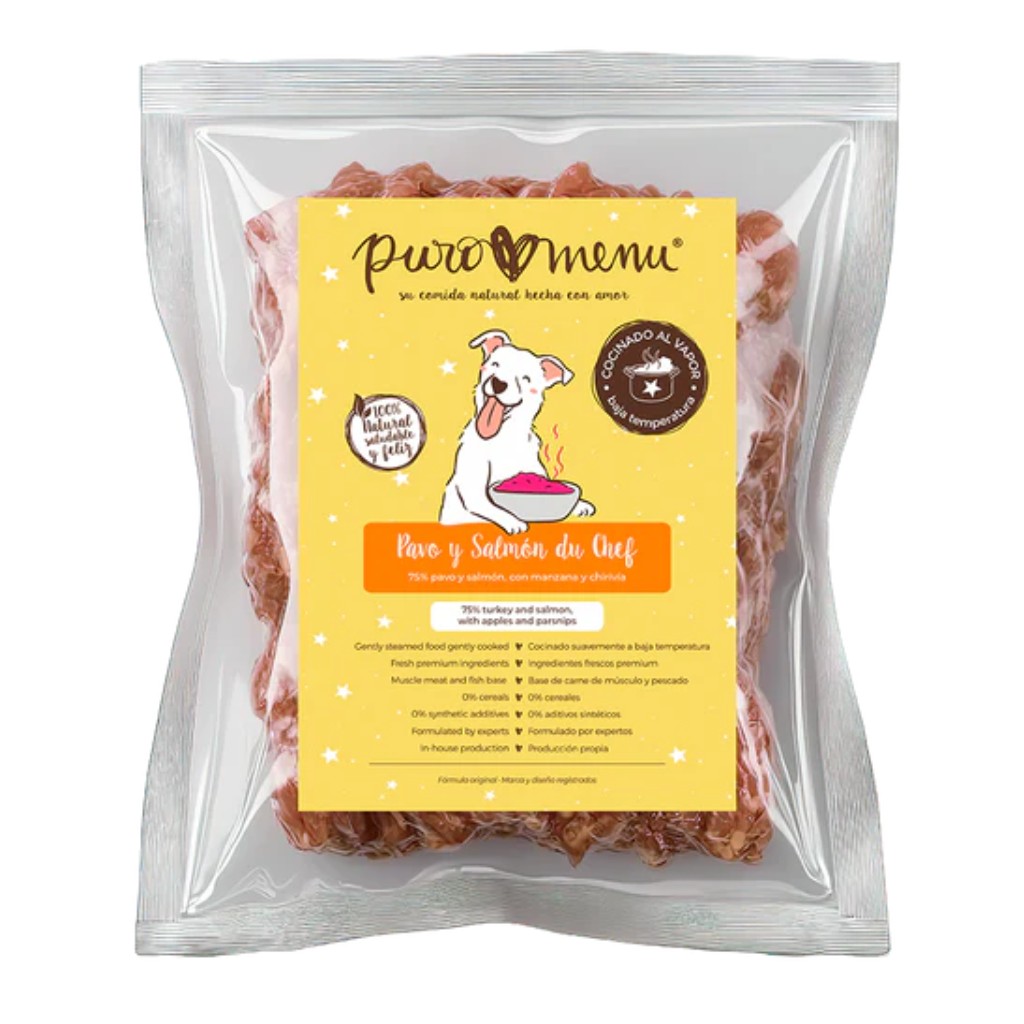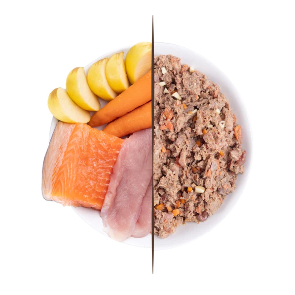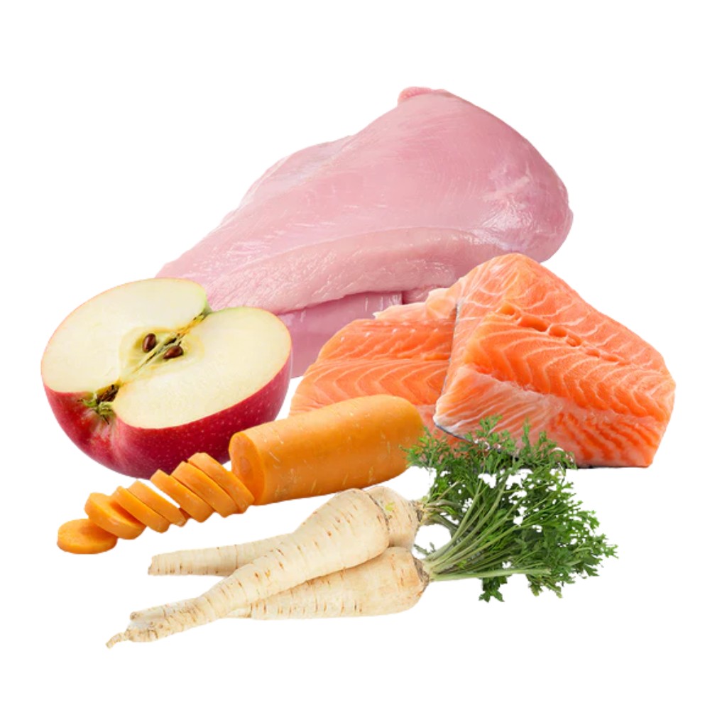 Composición: Carne de pavo (39,6%), zanahoria (16%), corazón de pavo (14,4%), salmón (14%), hígado de pavo (6%), manzana (3,7%), coco, chirivía (1,2%), judía verde, cáscara de huevo, semillas de chía, aceite de hígado de bacalao, algas marinas (ascophyllum nodosum), germen de trigo sarraceno