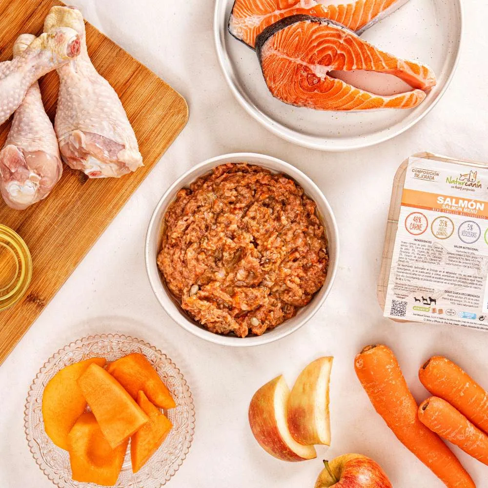 Ingredientes: Hueso carnoso de pollo: 35%, Carne de salmón: 30%, Carne de pollo: 9%, Molleja de pollo: 5%, Hígado de pollo: 5%, Zanahoria: 4%, Manzana: 4%, Calabaza: 3%, Corazón de pollo: 2%, Cáscara huevo en polvo, ajo y algas marinas: 2%, Perejil: 1%.
